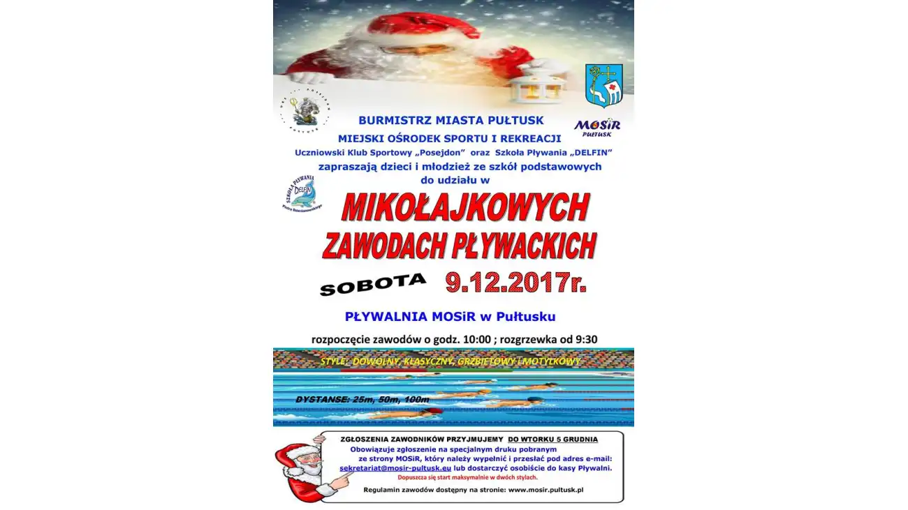 Mikołajki już 6 grudnia! MOSiR wraz z Burmistrzem Miasta oraz z UKS Posejdon i Szkołą Pływania "Delfin" zapraszają do udziału w Mikołajkowych Zawodach Pływackich.