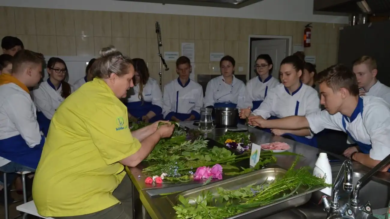 Właśnie rośliny były tematem przeprowadzonych w szkole warsztatów. Restauratorka przywiozła ze sobą mnóstwo ziół i kwiatów, m. in. koniczynę łąkową, lebiodkę, krwawnik, pokrzywę, bluszcz, bratki, stokrotki, tatarak, perz, rokitnik i wiele innych. Uczniowie mieli niepowtarzalną okazję dowiedzieć się, jak wykorzystać te wszystkie rośliny w kuchni. Na przykład z naparu z lipy można przygotować galaretkę, wodzie do picia można nadać smak przez dodatek kolorowych bratków, z rokitnika sporządzić sos do mięs, szpinak w cieście „leśne runo” zastąpić pokrzywą, a z perzu wykonać przekąskę w postaci paluszków w tempurze. Było niezwykle ciekawie i smacznie.