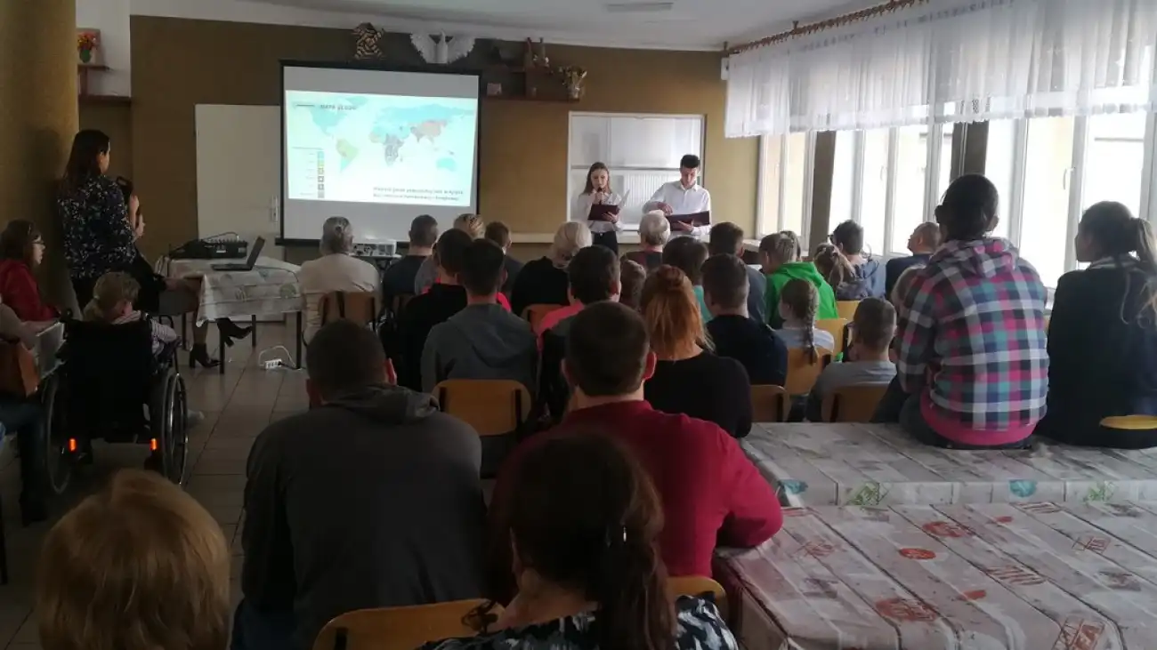 31 października Dagmara Piątkowska i Aleksy Maga z klasy II TŻ z Zespołu Szkół im. B.Prusa w Pułtusku, pod opieką pani Elżbiety Błaszczyk i pani Marty Kuleszy, przedstawili młodzieży Specjalnego Ośrodka Szkolno–Wychowawczego im. Anny Karłowicz w Pułtusku prezentację dotyczącą problemu głodu, niedożywienia oraz marnowania żywności.