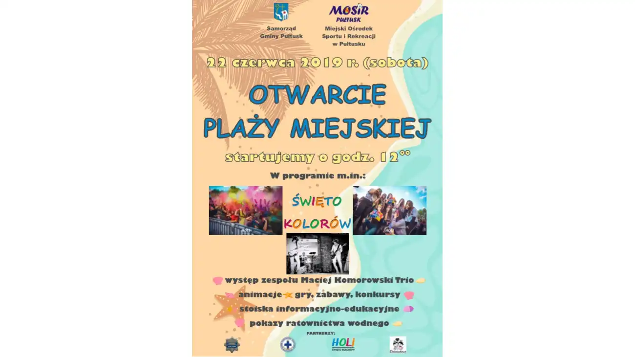 Podczas oficjalnego otwarcia sezonu letniego w Pułtusku na plaży miejskiej odbywać się będą imprezy towarzyszące: Święto Kolorów, koncert, animacje dla dzieci, pokazy ratownictwa wodnego. Początek o godz. 12.00.