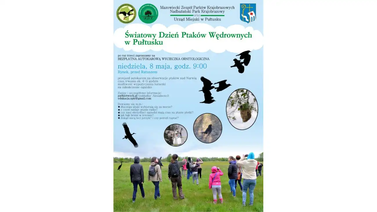Corocznie od 2006 r. w drugi weekend maja obchodzimy Światowy Dzień Ptaków Wędrownych. Celem święta jest promowanie ochrony wędrujących ptaków na całym świecie, szczególnie tych zagrożonych wyginięciem. 8 maja (niedziela) Nadbużański Park Krajobrazowy i Urząd Miejski w Pułtusku zapraszają na bezpłatną wycieczkę ornitologiczną (autokarową) nad Narew.