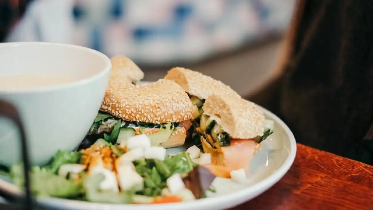 Kanapka z ciemnego pieczywa ze świeżym szpinakiem oraz czerwoną papryką