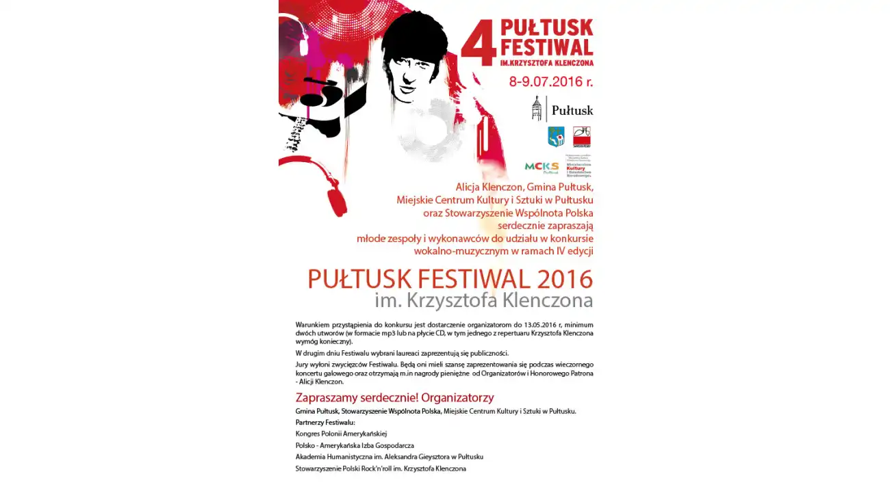 IV Pułtusk Festiwal im. Krzysztofa Klenczona odbędzie się w dniach 8-9 lipca 2016 w mieście urodzin artysty. Na dwóch festiwalowych scenach wystąpią gwiazdy polskiej sceny. Organizatorzy przewidzieli także koncert specjalny pamięci Janusza Kondratowicza - przyjaciela Krzysztofa Klenczona oraz autora tekstów piosenek m.in dla Czerwono-Czarnych, Czerwonych Gitar, Anny Jantar, Krzysztofa Krawczyka, Haliny Frąckowiak, Urszuli Sipińskiej, Rezerwatu, Krzysztofa Klenczona, Jacka Lecha i wielu innych artystów.