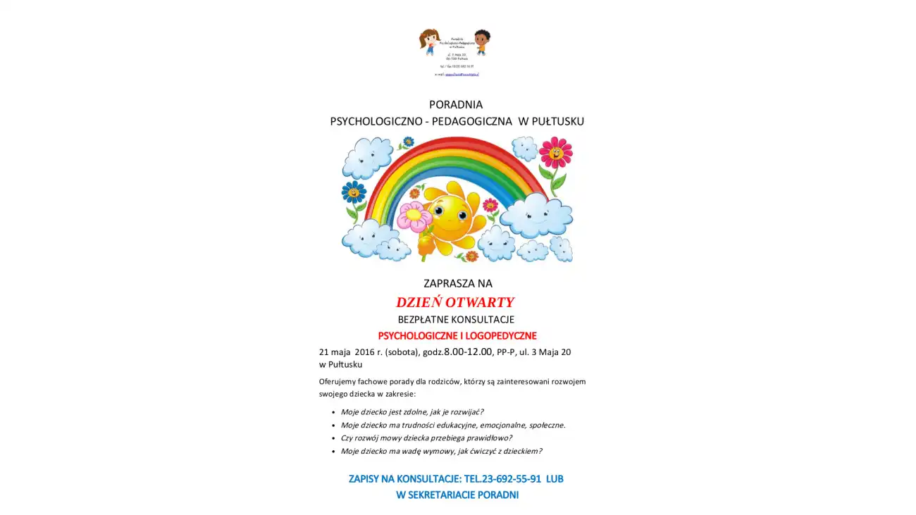 Dania 21 maja (sobota) w godz 8.00-12.00 Poradnia Psychologiczno-Pedagogiczna w Pułtusku organizuje Dzień Otwarty. Tego dnia rodzice będą mogli uzyskać fachowe porady i pomoc dotyczącą ich pociech.