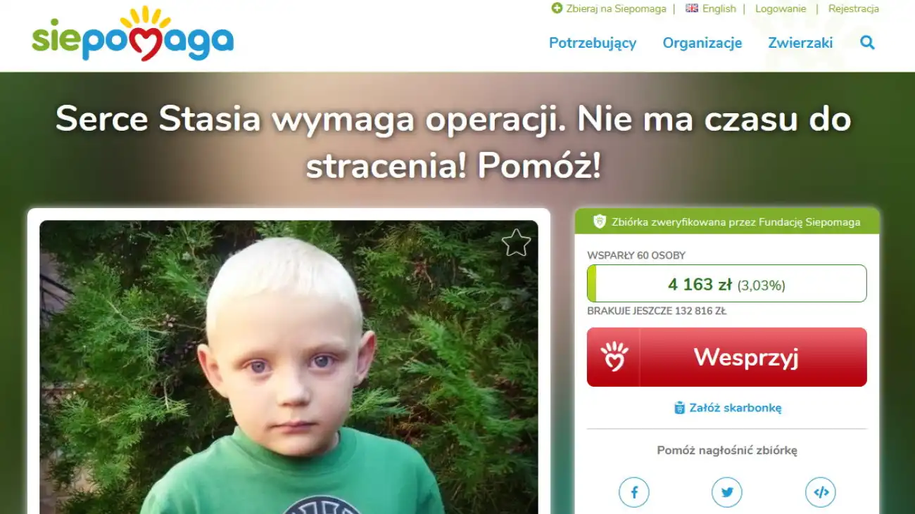 Staś ma zaledwie pięć lat, a już doznał tyle cierpienia. Każdy rodzic widząc cierpienie swojego dziecka chciałby mu pomóc, ale niestety czasami jest to niemożliwe. Dlatego kochani zwracamy się dziś do Was o wsparcie w zebraniu kwoty 130 tyś zł na operację serduszka Stasia. Operacja pozwoli chłopcu na odzyskanie radości życia i normalnego dzieciństwa.