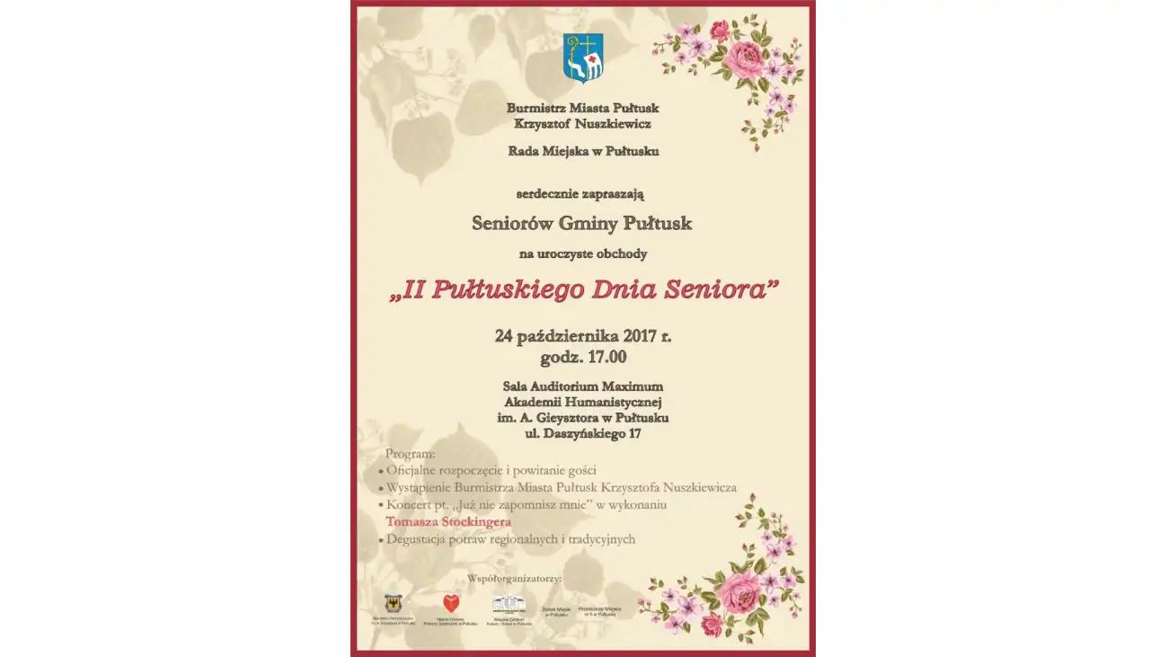 Dnia 24 października br. w Sali Auditorium Maximum w Akademii Humanistycznej ul. Daszyńskiego 17, odbędą uroczyste obchody II Pułtuskiego Dnia Seniora.