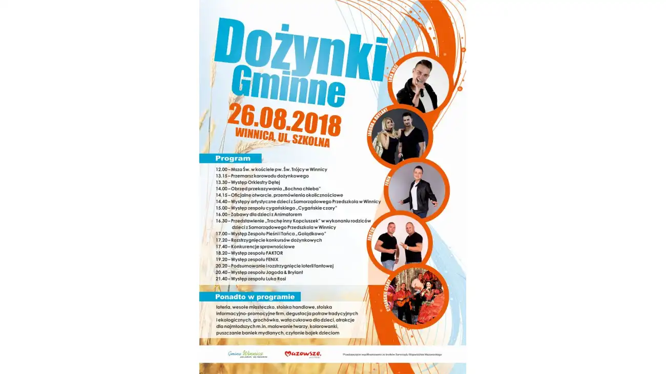 Dla uczestników dożynek wystąpią dzieci, oraz rodzice dzieci z Samorządowego Przedszkola w Winnicy, którzy zaprezentują przedstawienie "Trochę inny Kopciuszek". Wystąpią również Zespół Pieśni i Tańca „Golądkowo” oraz zespoły Fenix, Faktor, Jagoda&Brylant, Cygańskie Czary i Luka Rosi.