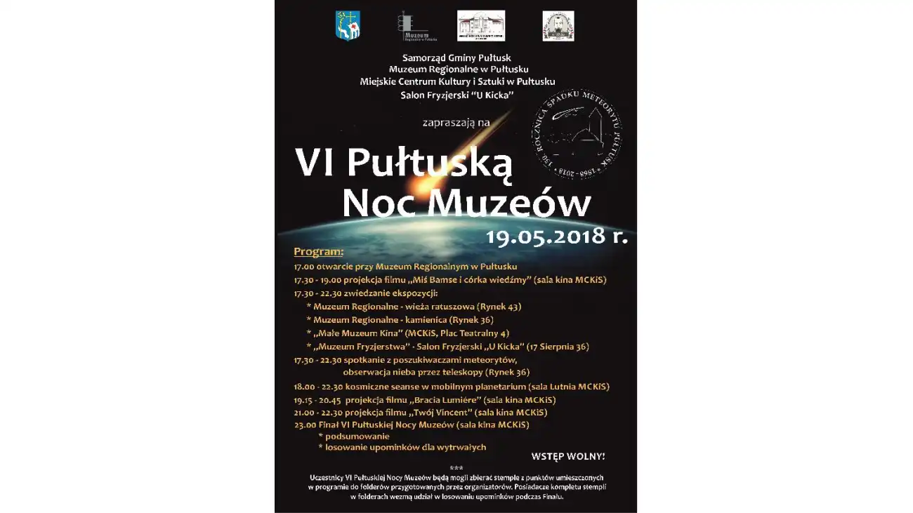 Noc Muzeów odbywa się w Pułtusku już po raz szósty. Obecna edycja obchodzona będzie 19 maja 2018r. pod znakiem 150-lecia spadku największego na świecie deszczu meteorytów kamiennych.