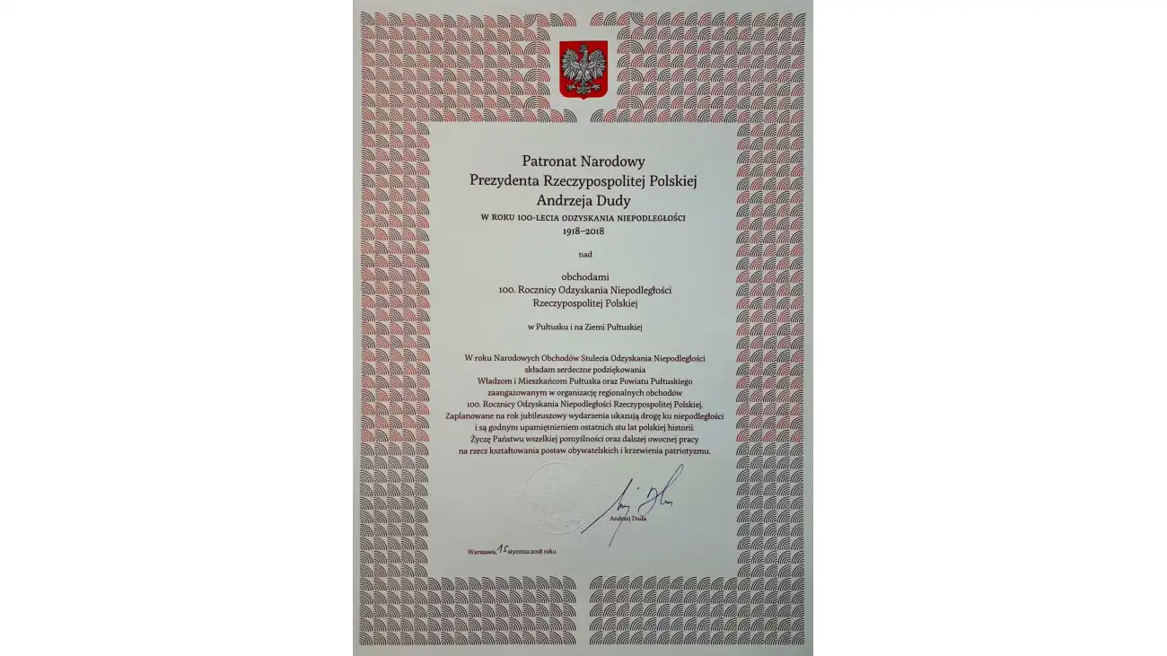 Prezydent Rzeczypospolitej Polskiej Andrzej Duda udzielił Patronatu Narodowego nad pułtuskimi obchodami 100. Rocznicy Odzyskania Niepodległości przez Polskę.