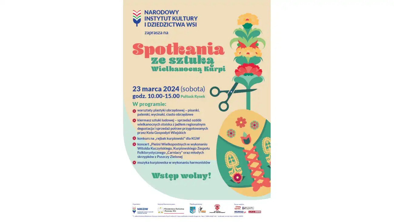 Przed pułtuskim Ratuszem odbędzie się, jak co roku, kiermasz wielkanocny podczas, którego swoje prace zaprezentują twórcy ludowi, rękodzielnicy oraz koła gospodyń wiejskich. Gospodynie będą mogły wziąć udział w konkursie „rejbak kurpiowski”, czyli tradycyjną zapiekankę z tartych zmienników, z dodatkiem mięsa i cebuli.