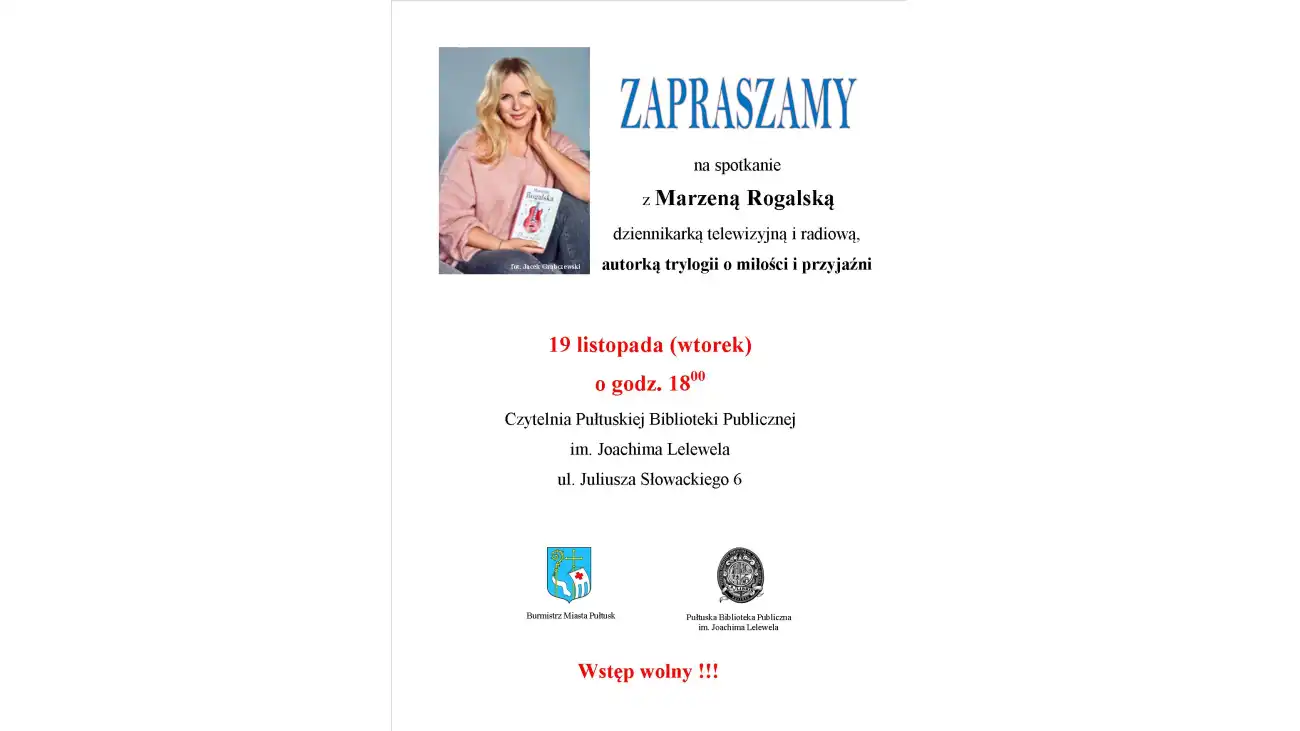 Pułtuska Biblioteka Publiczna im. J. Lelewela zaprasza na spotkanie z Marzeną Rogalską - dziennikarką telewizyjną i radiową, autorką trylogii o miłości i przyjaźni.
