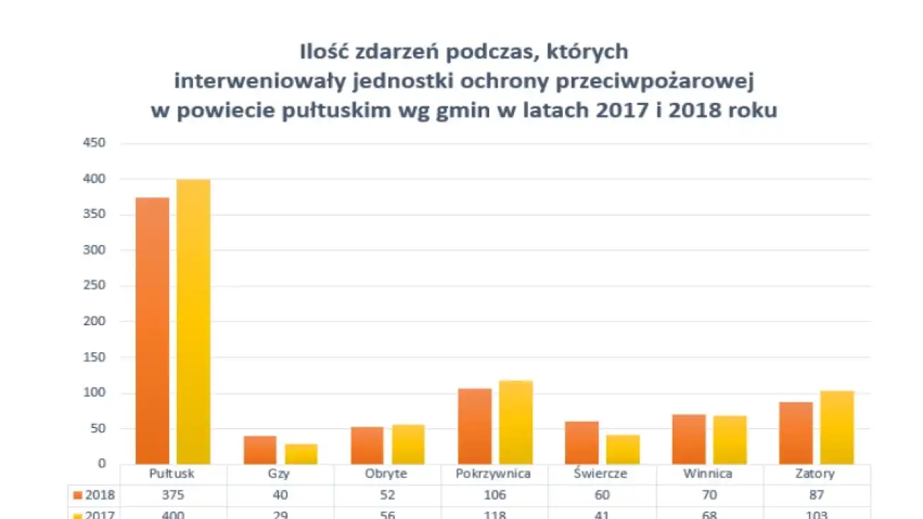 Komenda Powiatowa Państwowej Straży Pożarnej w Pułtusku podsumowała 2018 rok. Ogółem w powiecie pułtuskim miało miejsce 790 zdarzeń z czego - 210 zdarzeń to pożary, natomiast 539 to miejscowe zagrożenia. Wśród tych zdarzeń odnotowano 41 alarmów fałszywych (26 w dobrej wierze i 15 z systemu sygnalizacji pożaru). Zaistniałe w 2018 r. zdarzenia spowodowały straty w wysokości szacowanej na 3 905,6 tys. zł. Śmierć poniosło 11 osób, natomiast obrażeń doznało 100 osób, w tym 8 dzieci.