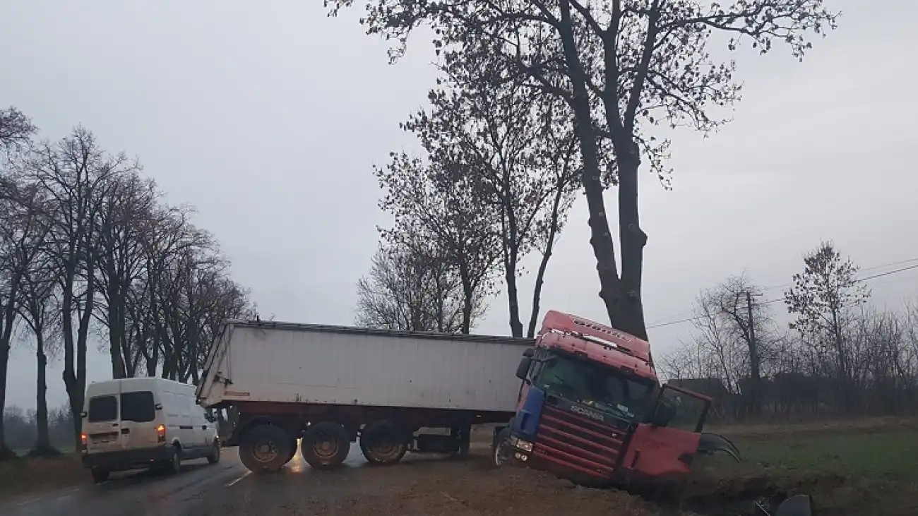 Jak informuje sierż. Daniel Podlasin z pułtuskiej policji - Dziś około godz. 6.00 kierujący samochodem ciężarowym Scania w miejscowości Łubienica - Superunki na drodze krajowej nr 61 chcąc uniknąć zderzenia z poprzedzającym go samochodem osobowym zjechał do przydrożnego rowu, czym spowodował zablokowanie jednego pasa ruchu. Przyczyną zdarzenia było niedostosowanie prędkości do panujących warunków na drodze. Ruch na danym odcinku drogi odbywał się wahadłowo.