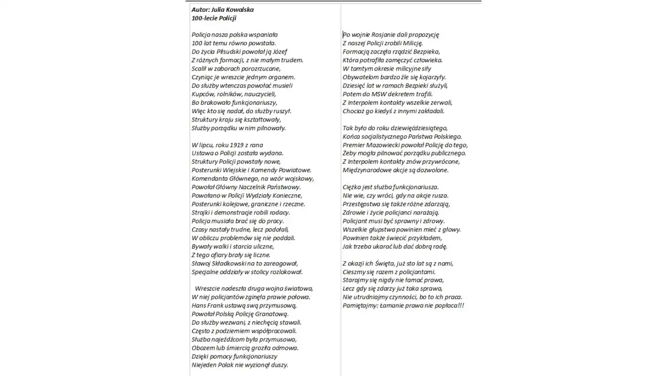 Julia Kowalska z gm. Zatory pisząc wiersz pt. 100-lecie Policji, decyzją Komisji Konkursowej Wojewódzkich Eliminacji zdobyła I miejsce. Zwycięska praca będzie reprezentowała garnizon mazowiecki w ogólnopolskim finale, w kategorii literackiej, który organizuje Komenda Głowna Policji.