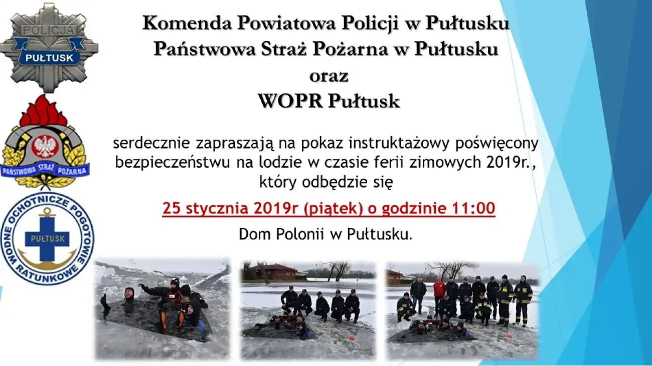 Pułtuskie służby zapraszają na pokaz instruktażowy poświęcony bezpieczeństwu na lodzie - 25 stycznia br. (piątek) o godzinie 11.00 na terenie Domu Polonii w Pułtusku.