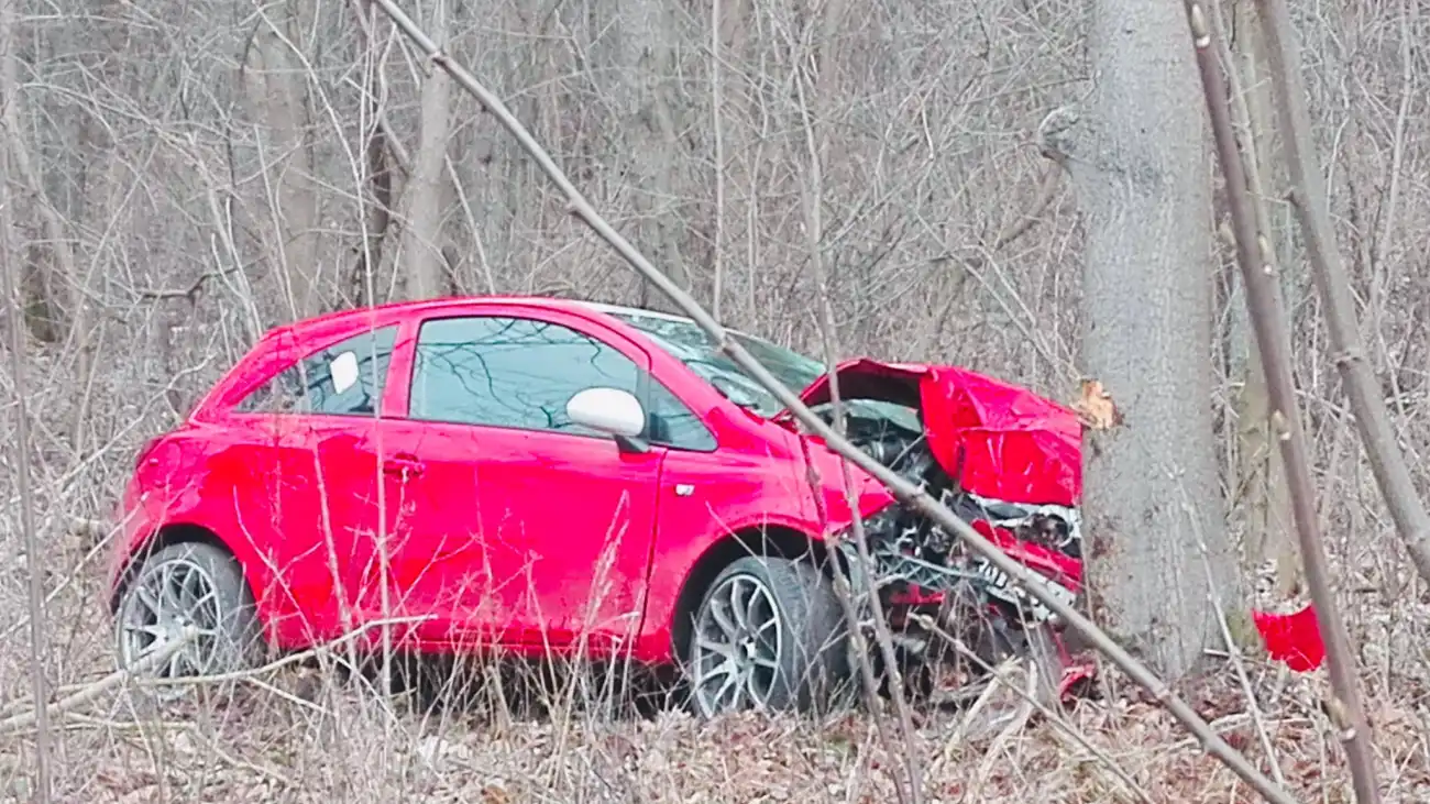 Nieznany kierowca Opla Corsy doprowadził do kolizji. Wjechał w las i z ogromną siłą uderzył przodem auta w drzewo. Prawdopodobnie ranny kierowca, zbiegł z miejsca zdarzenia pozostawiając uszkodzone auto.