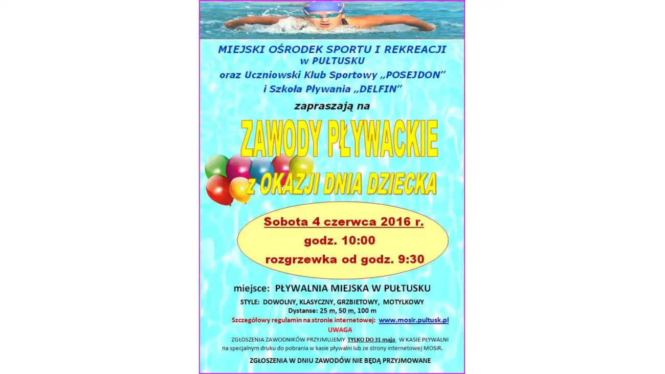 Z okazji Dnia Dziecka MOSiR wraz z UKS "Posejdon" oraz Szkołą Pływania "Delfin" zapraszają na Zawody Pływackie w sobotę 4 czerwca o godz. 10.00