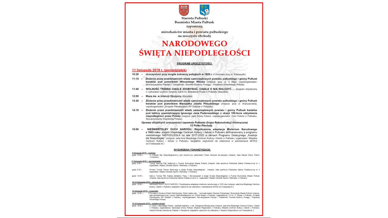 11 listopada, w kolejną rocznicę Narodowego Święta Niepodległości, Starosta Pułtuski wraz z Burmistrzem Miasta Pułtusk zapraszają mieszkańców miasta i powiatu pułtuskiego do udziału we wspólnych uroczystościach.