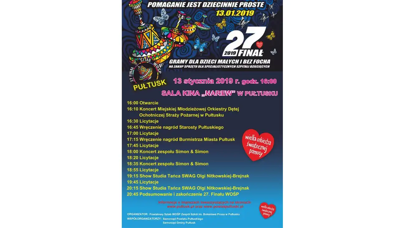 W Pułtusku od 27 lat działa Powiatowy Sztab w Zespole Szkół im. B. Prusa w Pułtusk, którego szefem jest pani Teresa Zielinska. 27. Finał odbędzie się wzorem lat ubiegłych w sali kina MCKiS w Pułtusku.