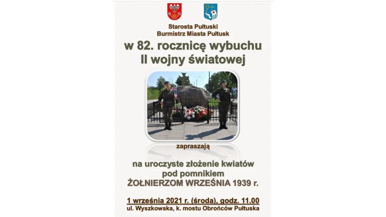 Starosta Pułtuski, Burmistrz Miasta Pułtusk w 82. rocznicę wybuchu II wojny światowej zapraszają na uroczyste złożenie kwiatów pod pomnikiem Żołnierzom Września 1939 r.
