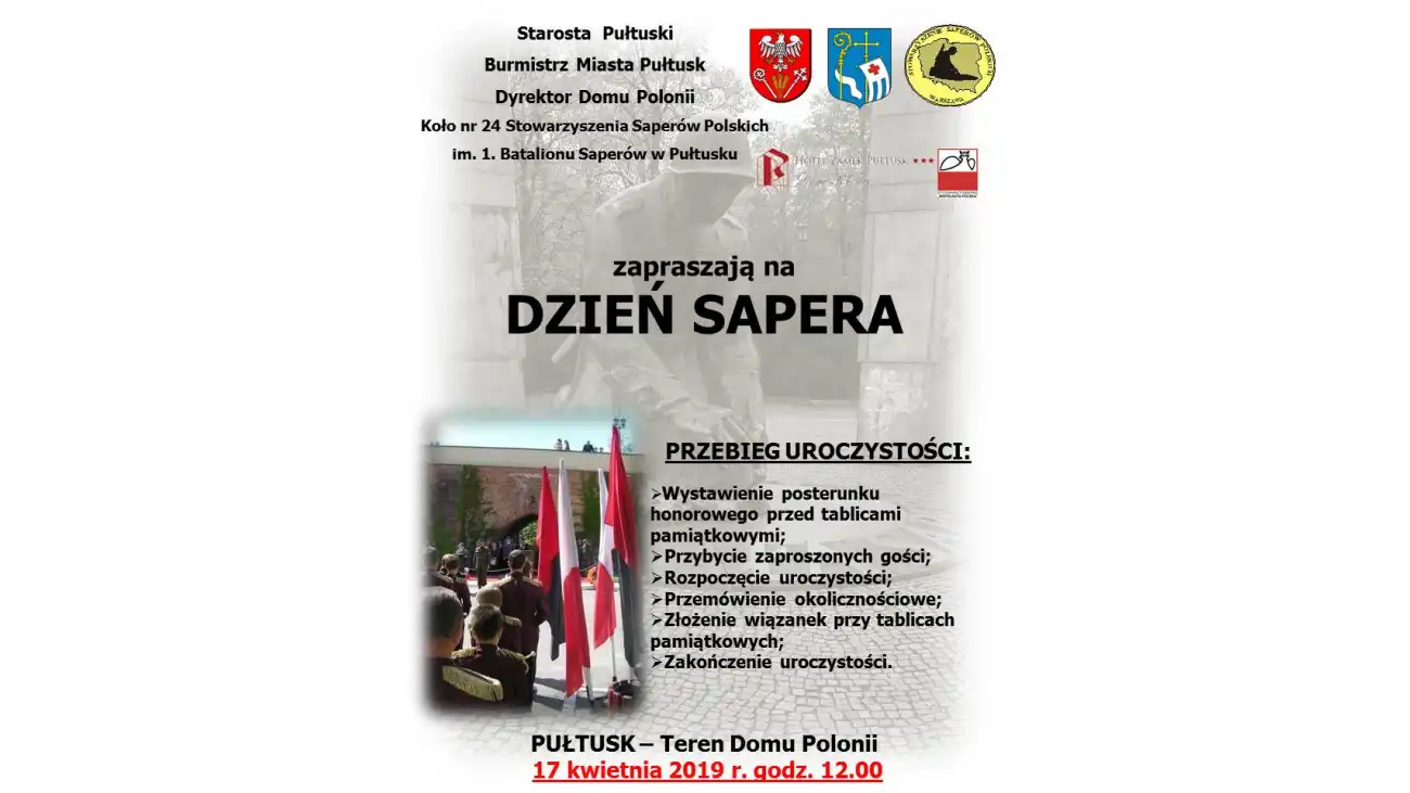 17 kwietnia br. o godz. 12:00 odbędą się obchody Dnia Sapera w Pułtusku. Przed tablicami pamiątkowymi na terenie Domu Polonii w Pułtusku odbędzie się złożenie kwiatów oraz zostaną wygłoszone przemówienia okolicznościowe.