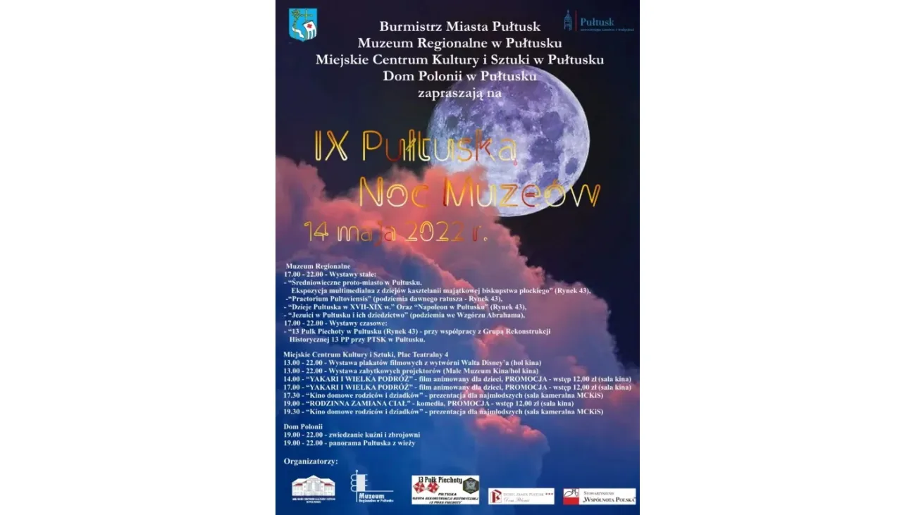 W sobotę 14 maja 2022r. odbędzie się kolejna edycja Pułtuskiej Nocy Muzeów. Zapraszamy w imieniu organizatorów. Szczegółowy program na załączonym plakacie.