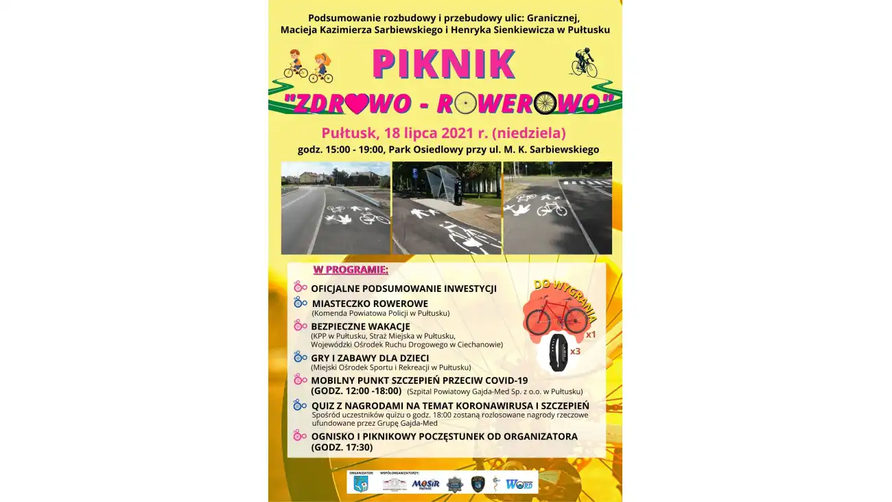 W najbliższą niedzielę 18 lipca 2021 r. w godzinach 15.00 – 19.00 w Parku Osiedlowym przy ul. M. K. Sarbiewskiego na pułtuskich Popławach odbędzie się Piknik “ZDROWO – ROWEROWO".