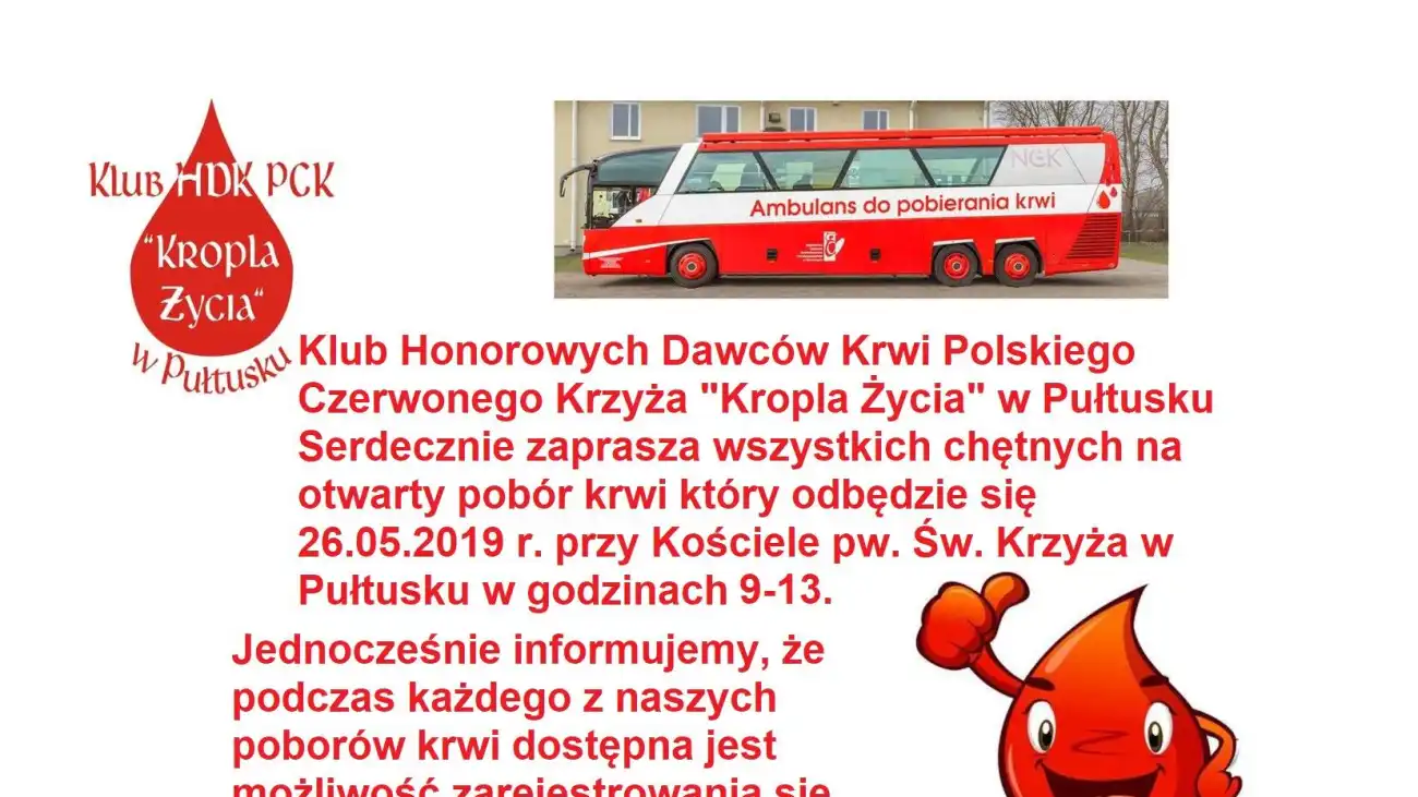 W najbliższą niedzielę 26 maja na parkingu przy kościele św. Krzyża w Pułtusku odbędzie się otwarty pobór krwi oraz możliwość zarejestrowania się w bazie potencjalnych dawców szpiku. Na pobór zaprasza Klub HDK PCK "Kropla Życia" w Pułtusku oraz księża z Parafii Rzymskokatolickiej pw. św. Stanisława Kostki w Pułtusku.