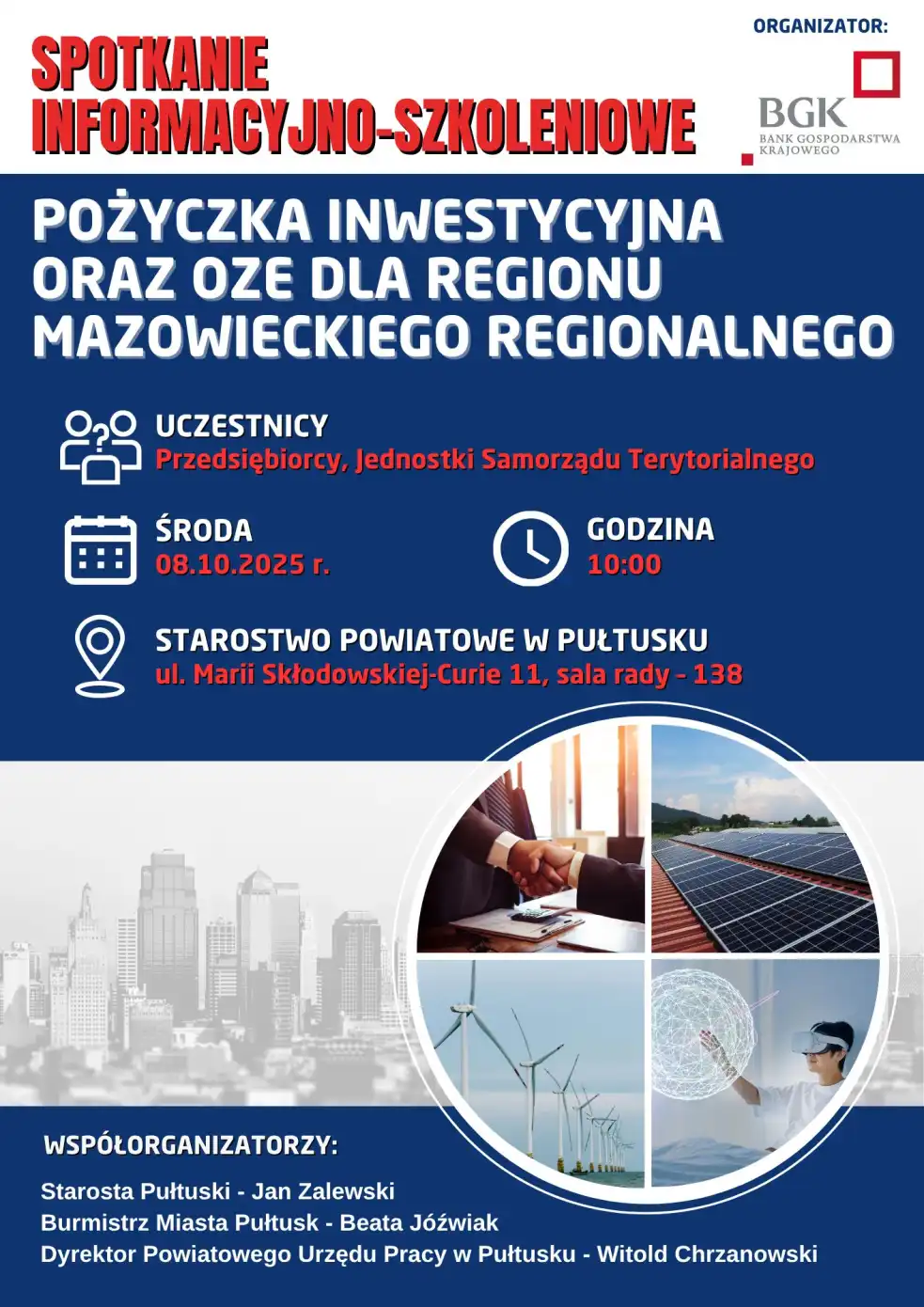 8 października 2025 roku w Pułtusku odbędzie się ważne wydarzenie dla przedsiębiorców oraz jednostek samorządu terytorialnego. Bank Gospodarstwa Krajowego (BGK) zaprasza na spotkanie informacyjno-szkoleniowe poświęcone pożyczkom inwestycyjnym oraz wsparciu dla odnawialnych źródeł energii (OZE) w regionie mazowieckim.