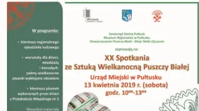 Po raz dwudziesty w Pułtuskim Ratuszu odbędą się Spotkania ze Sztuką Wielkanocną Puszczy Białej. Organizatorzy zapraszają 13 kwietnia 2019 r. w godz. 10:00 – 13:00 do holu głównego Urzędu Miejskiego przy ul. Rynek 41.