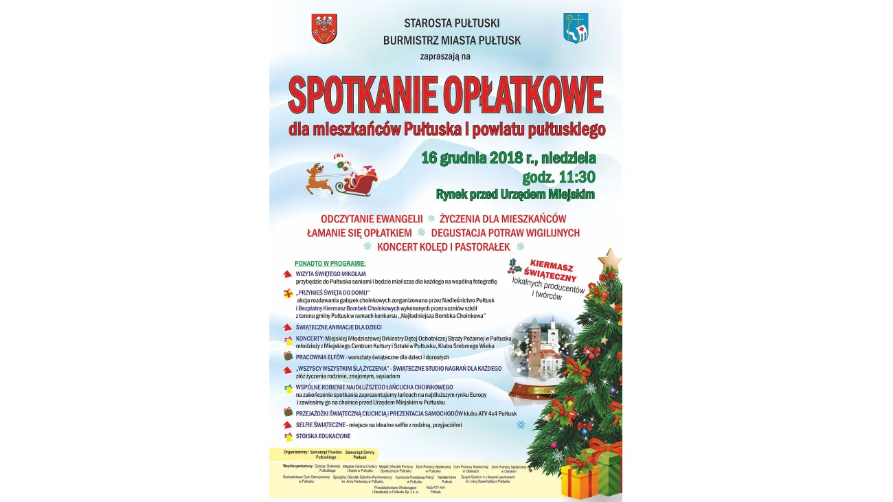 16 grudnia br od godz. 11.30 na pułtuskim rynku przed Urzędem Miasta Pułtusk odbędzie się uroczyste spotkanie opłatkowe dla mieszkańców miasta i powiatu połączone z kiermaszem świątecznym i wieloma atrakcjami.