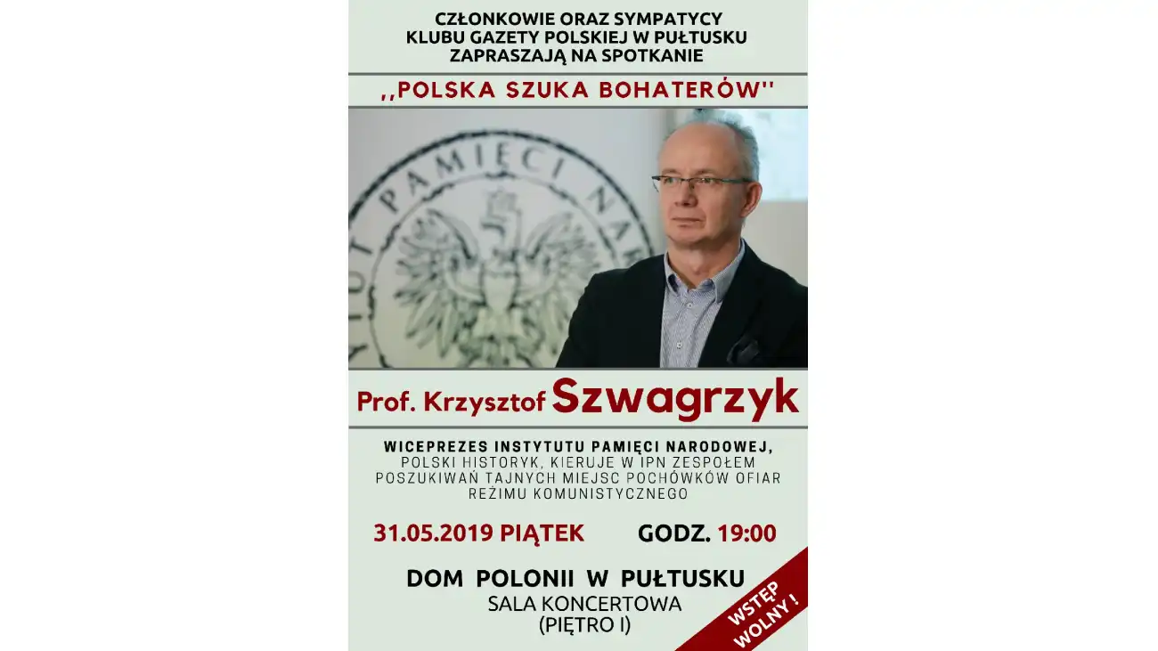31 maja br. w Domu Polonii w Pułtusku odbędzie się spotkanie z Profesorem Krzysztofem Szwagrzykiem - wiceprezesem Instytutu Pamięci Narodowej, historykiem, który od kilku lat kieruje w IPN zespołem poszukiwań tajnych miejsc pochówku ofiar reżimu komunistycznego.