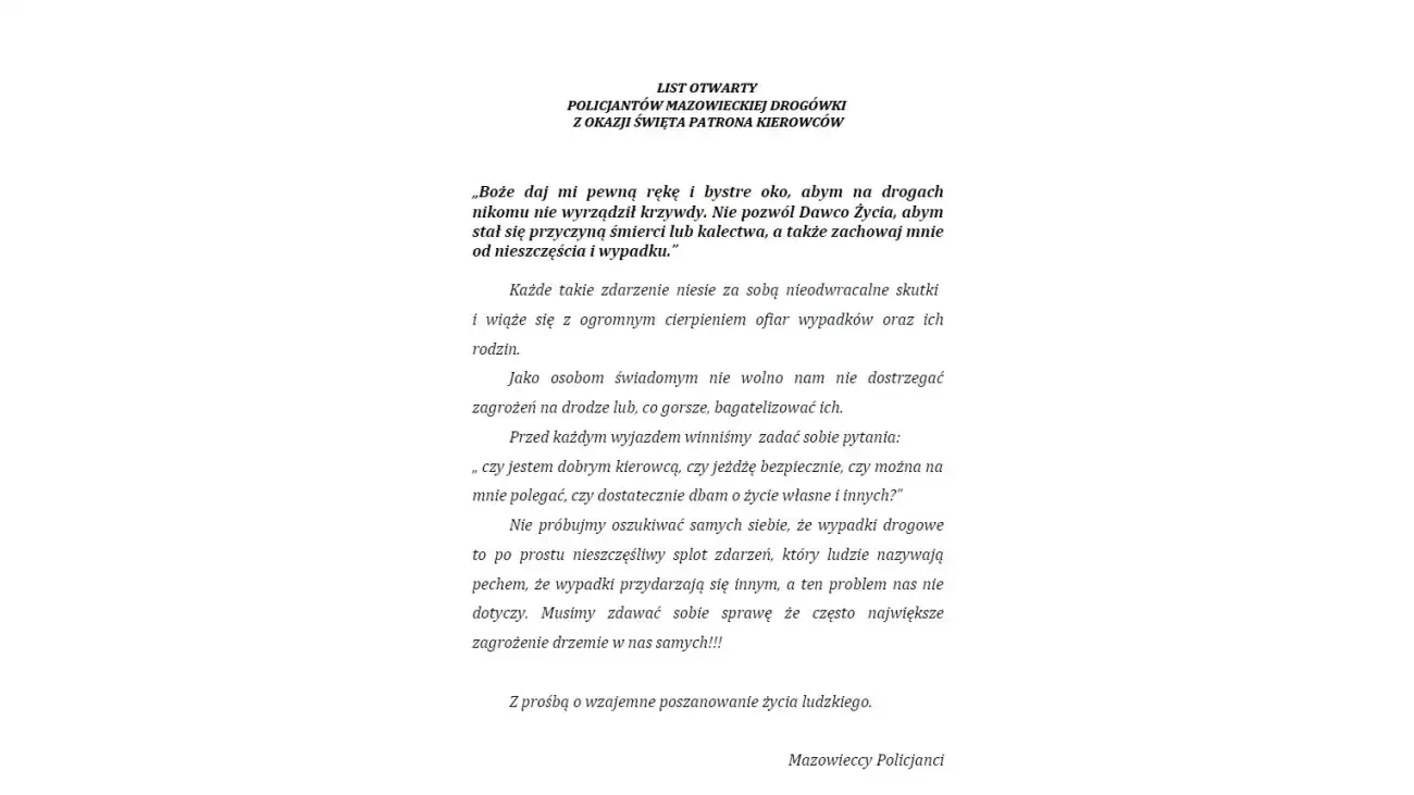 Dzisiaj 25 lipca obchodzimy święto patrona kierowców - św. Krzysztofa. W związku z tym Mazowieccy Policjanci wystosowali oficjalny list do kierowców.