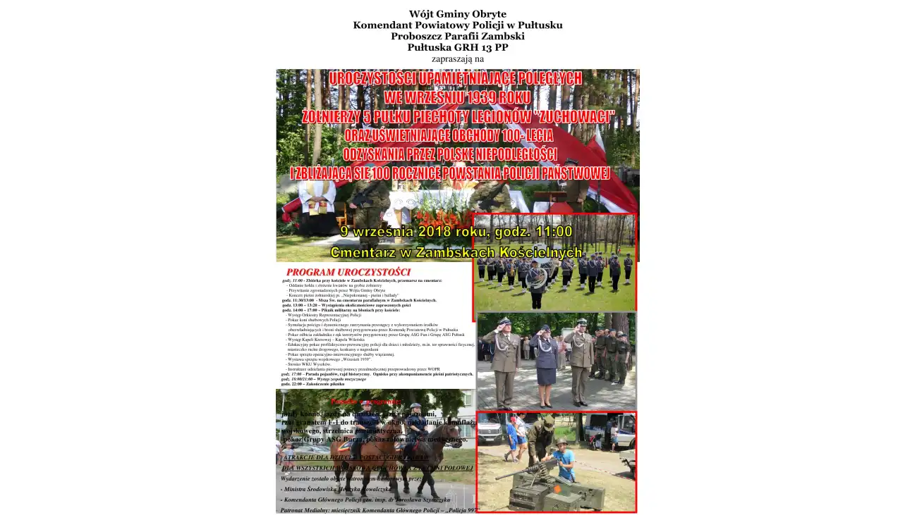 9 września 2018 roku o godzinie 11:00 w Zambskach Kościelnych odbędą się uroczystości upamiętniające Poległych we wrześniu 1939 roku Żołnierzy 5 Pułku Piechoty Legionów "Zuchowaci" oraz uświetniające obchody 100-lecia odzyskania przez Polskę Niepodległości i zbliżającą się 100. rocznicę powstania Policji Państwowej.