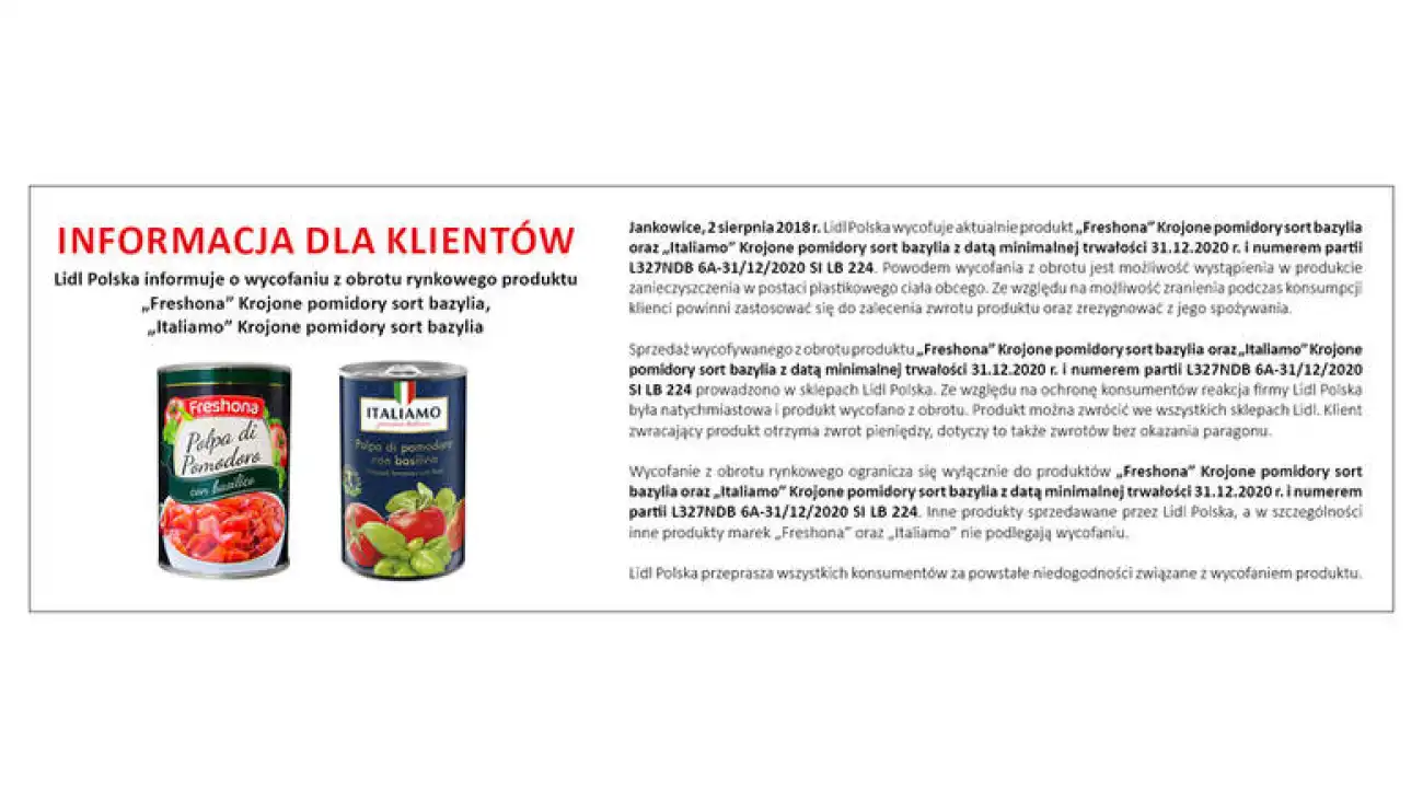 W całej Polsce sieć Lidl wycofuje ze sprzedaży część partii krojonych pomidorów w puszkach. Powodem jest " plastikowe ciało obce", które może znajdować się w serii podanej przez sieć.