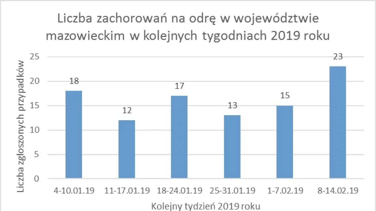 - Grafika pochodzi z Komunikatu Państwowego Wojewódzkiego Inspektora Sanitarnego w Warszawie nt. występowania zachorowań na odrę w województwie mazowieckim. Stan na dzień 14 lutego 2019 r.