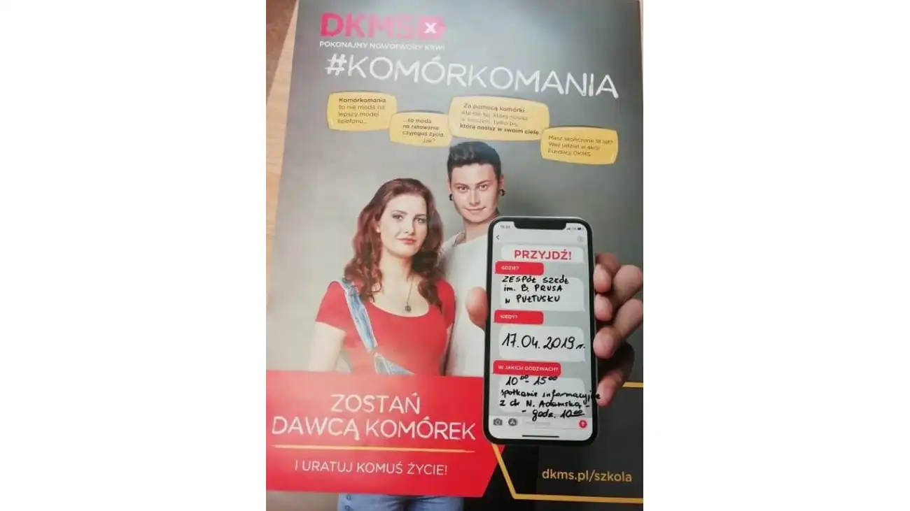 Już jutro - 17 kwietnia 2019 r. w Zespole Szkół im. B. Prusa w Pułtusku można zostać potencjalnym dawcą komórek macierzystych i uratować komuś życie Akcja będzie prowadzona od godz. 10.00.